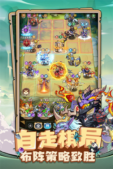 游戏在原有的玩法上增加了,自走棋玩法,玩家通过放置武将位置,来进行策略布阵,发挥出武将的特性,极限微操,平民也能打出高额伤害!