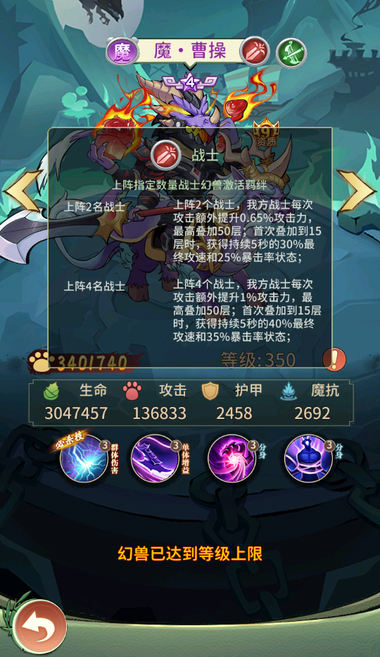 上阵4名战士:我方战士每次赶紧额外提升1%攻击力,最高叠加50层;首次叠加到15层时,获得持续5秒的40%最终攻速和35%暴击率状态。