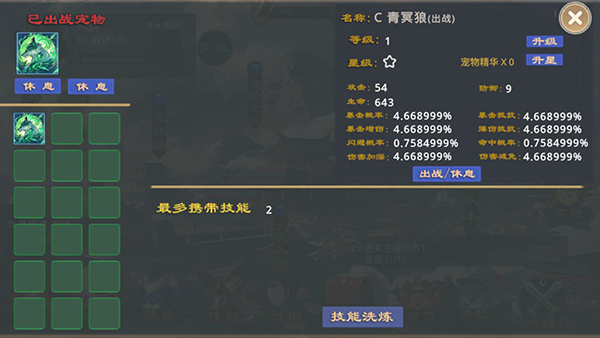 5、每种灵宠都有独特的技能,玩家在宠物达到五级时可以对其技能进行洗练升级,增加额外属性,提升战力,技能增加的属性只在战斗中生效。