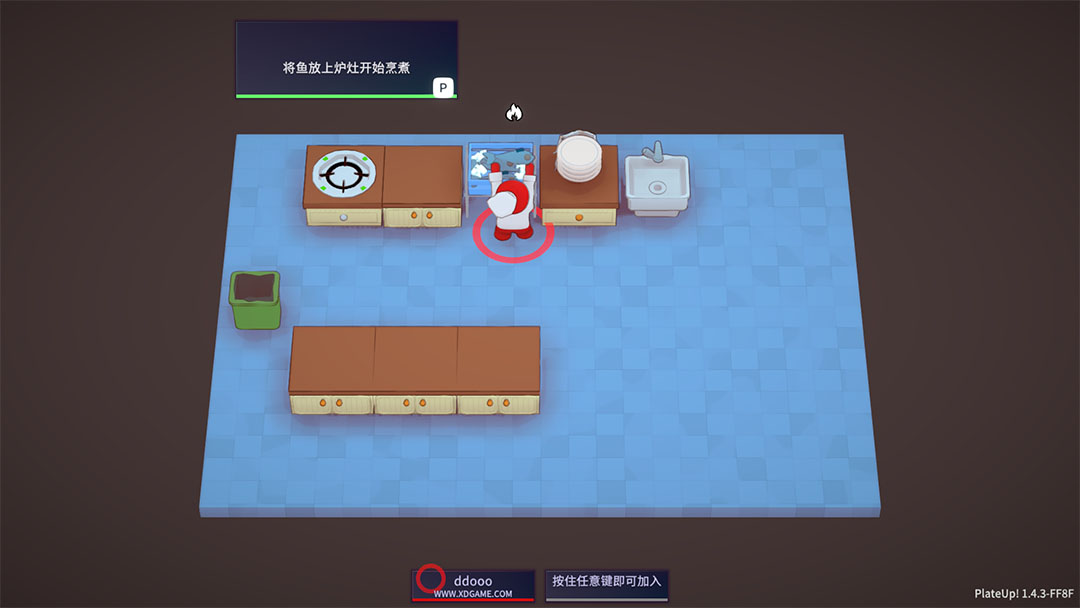 2、这里我们先拿起鱼,然后移动到灶台开始烹饪。