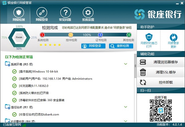 检测系统环境、信任站点、IE设置检测、网络配置、网银控件。