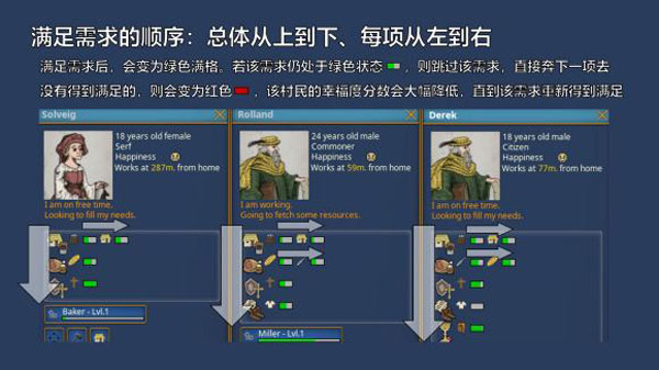 【二】随着村民身份等级的提升,需求也会增多,不过都是按照一定顺序来满足。每个需求都一个能量槽,满足之后就会变为绿色满格,然后随时间逐渐减少,槽空了之后就需要在下一个动作循环继续满足这项需求来充满这个槽。