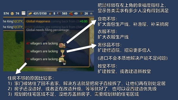 【三】每一项需求都会影响个人的幸福度数值,这里不细说具体算法。若有需求得不到满足,幸福度必定下降。其中可能导致住房不足的原因比较多,但是也比较好解决;而食物/衣物/奢侈品不足,通常都是由于产能不足,需要扩建生产线,某些情况也可能是由于物流不太行,需要扩建市场/仓库/粮仓