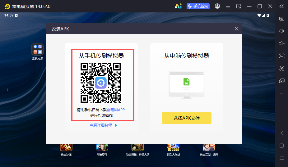 点击右侧功能栏的 “安装” 按钮后,会出现两个导入选项:选择 “从手机传到模拟器”,按照教程通过手机扫码,就能将手机里已下载的游戏安装包传输到模拟器并自动安装。