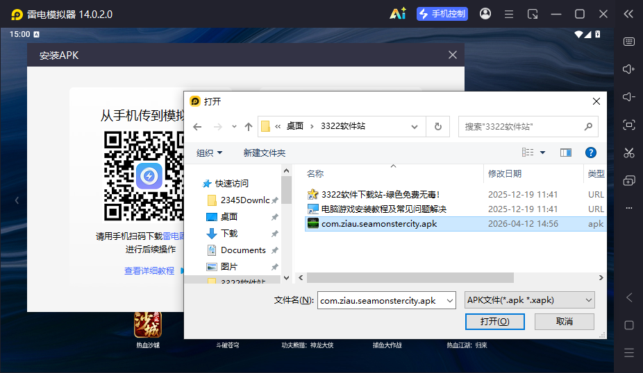 选择 “电脑导入”,则可以在弹出的文件管理器中,找到电脑本地存储的游戏APK文件,选中后点击确认,模拟器就会开始安装游戏,适合没有提前下载安装包或需要从手机迁移游戏的情况。