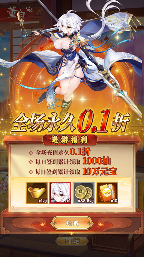 5、累计登录送100000元宝。