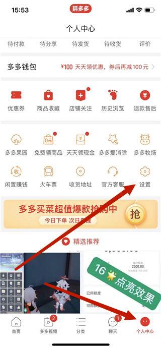 1、第一:手机打开拼多多进入【个人中心】选项然后点击【设置】。