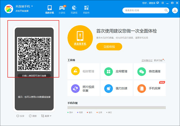 打开我们电脑的360手机助手,拿出我们的手机把电脑端的二维码扫描一下就可以了。