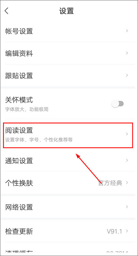 2、在【设置】页面内,点击选择【阅读设置】,进入其界面后,再次点击进入【个性化设置】的选项;