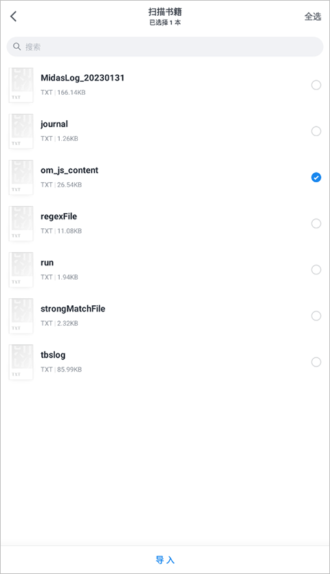 2、你可以从文件夹选择或直接使用app右上方的扫描功能,扫描书籍会更方便,扫描出来后,选择你要导入的书籍点击导入即可。