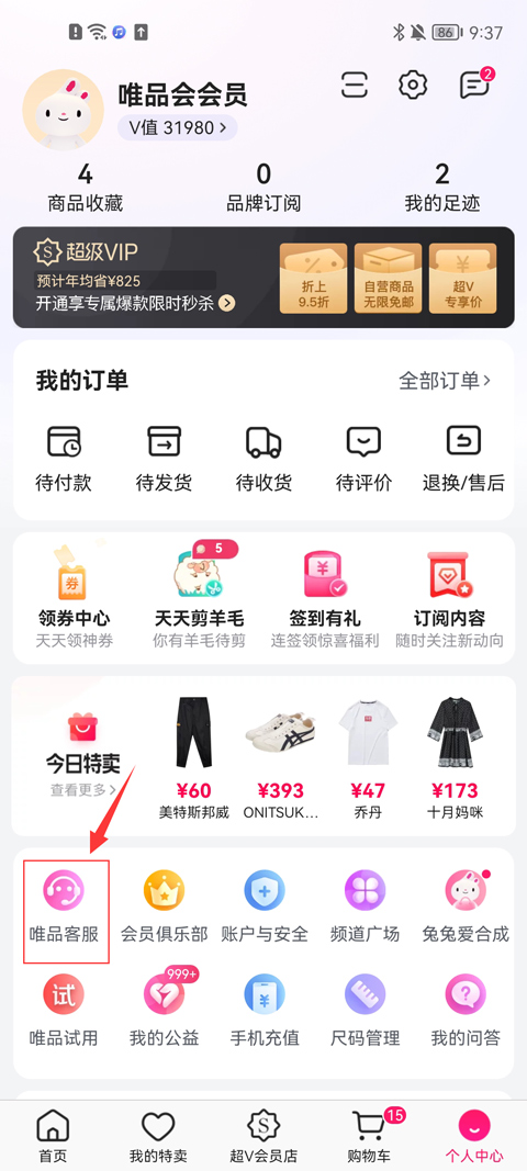 1、进入唯品会app,点击右下角人形图标进入个人中心,点击【我的资产】。