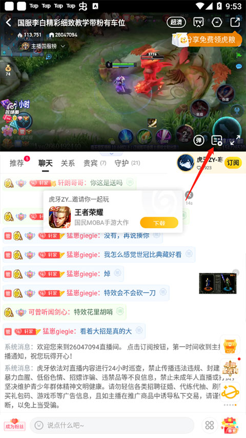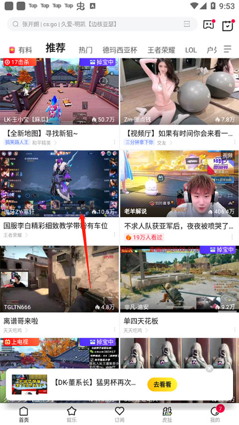 2、紧接着在虎牙直播主页面中,点击一个如图所示的直播视频进去,