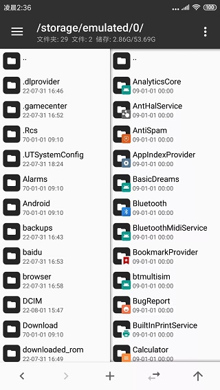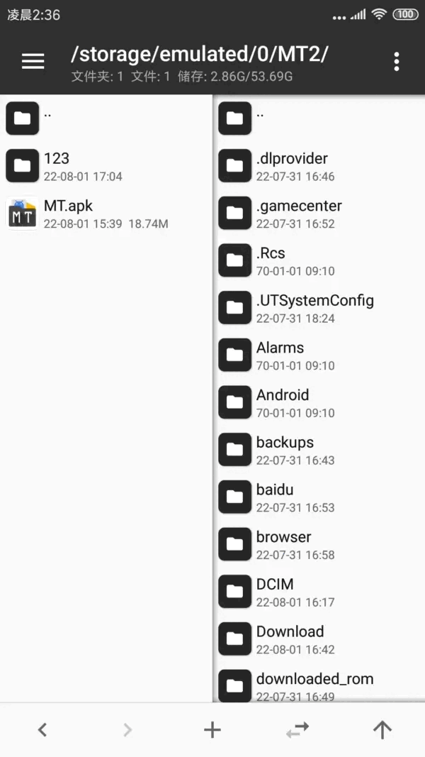 进入 MT 管理器,首先看到的是左右两个文件列表窗口。