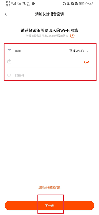 四、选择空调品牌,型号后,会进入到网络配置页面,将手机连接WiFi后,并点击下一步
