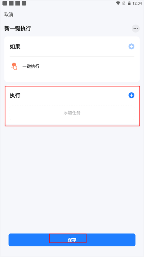 3、进入到执行操作编辑界面,在执行右边的“+”中添加任务和设备,最后点击保存即可执行相关的操作。