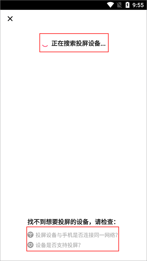 如图,已经开始搜索,如果搜索不到设备,那么就要注意以下两点:1、投屏的设备与手机是否连接了同一网络?;2、设备是否支持投屏?
