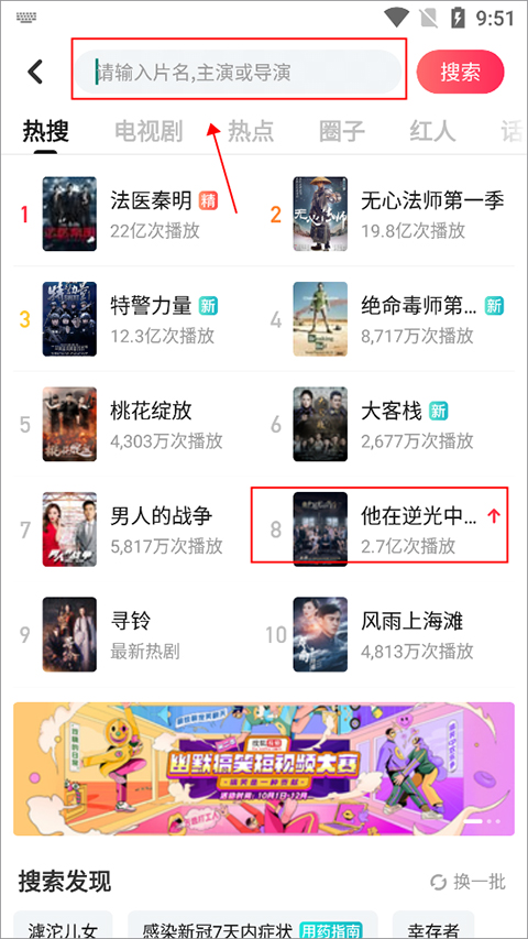 会看见很多的近期热搜推荐,如“法医秦明、无心法师第一季、特警力量、绝命毒师、桃花绽放、大客栈、男人的战争、以及他在逆光中”,这里小编选择他在逆光中,作为示例,如果推荐中没有你想要的,在搜索框搜索即可。