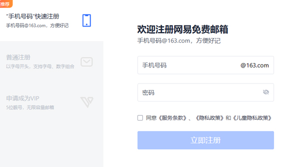 3、跳到注册页面之后,会有三种注册方式,”手机号码“快速注册是使用手机号@163.com,这种注册方式方便好记,普通注册是以字母开头,支持字母、数字组合,申请成为vip是5位靓号,拥有无限容量邮箱,看你自己选择哪种方式注册就行了。