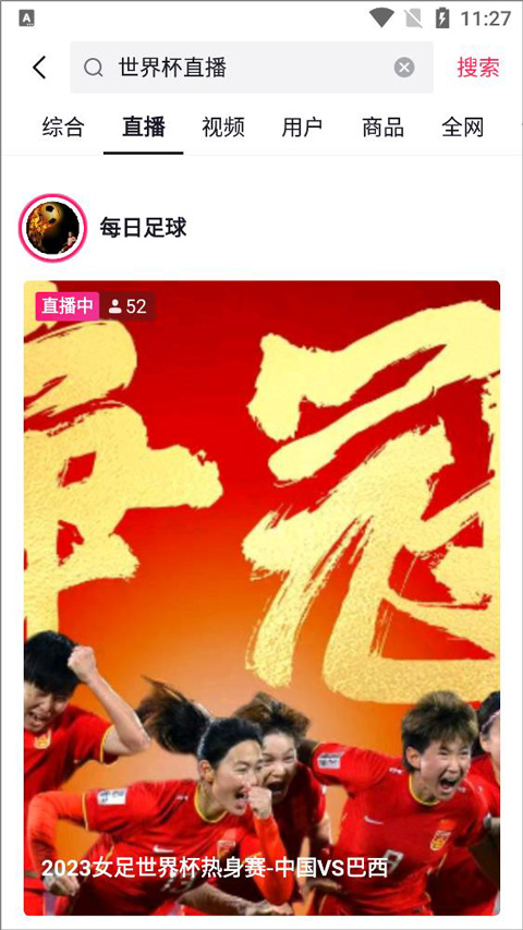 3、搜索结果出来后,点击直播栏目,下拉可查看正在直播中的世界杯足球比赛;
