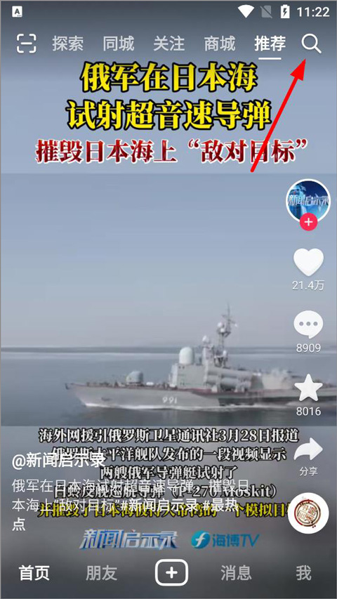1、打开抖音,点击右上角搜索按键;