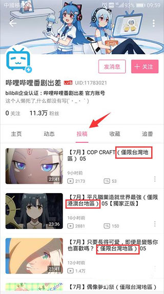 找到具体的“投稿”位置,即可看见他的一些投稿视频。他的投稿视频基本都是仅部分地区观看的动漫,你想要看什么在这里找就可以找到;