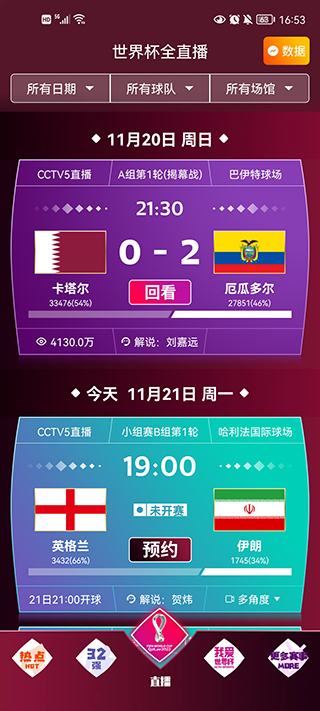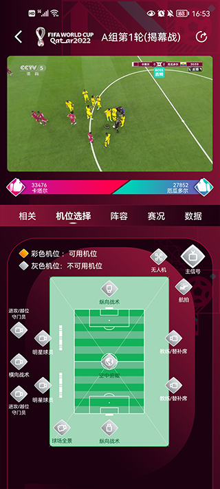 3、直播赛程就不用说了,非常详细,而且有多达14个机位的直播镜头,自由选择,想怎么看就怎么看,并且从赛前到赛后,有赛前准备、比赛回放、采访、花絮等分类非常详细的各种信息。