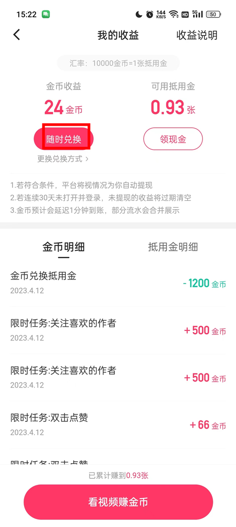 4、兑换之后回到我的会回到我的首页页面,在我的收益页面点击右边的领金币,然后根据你金币能兑换的余额兑换现金即可完成提现。