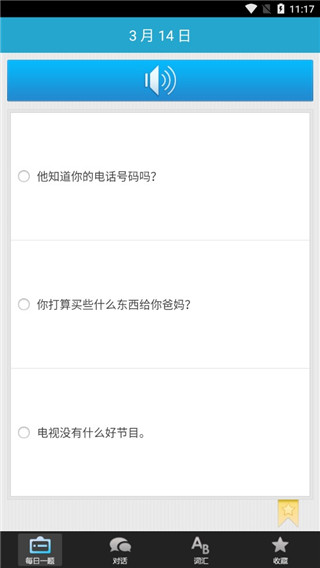 【收藏复习】:常用词汇、情景对话、每日一题,均可加入收藏并自动分类,便于学习者对喜欢的词句或者难点语句反复学习,以至巩固掌握。