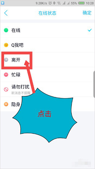 5、在打开的在线状态界面,选择离开选项,点击一下;
