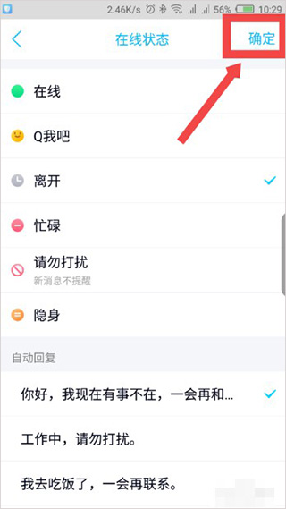 6、选择离开状态后,能看到下面可以设置自动回复,如下图所示;