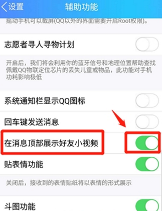 在【辅助功能】中将【在消息顶部展示好友小视频】按钮关闭即可将QQ好友小视频关闭。