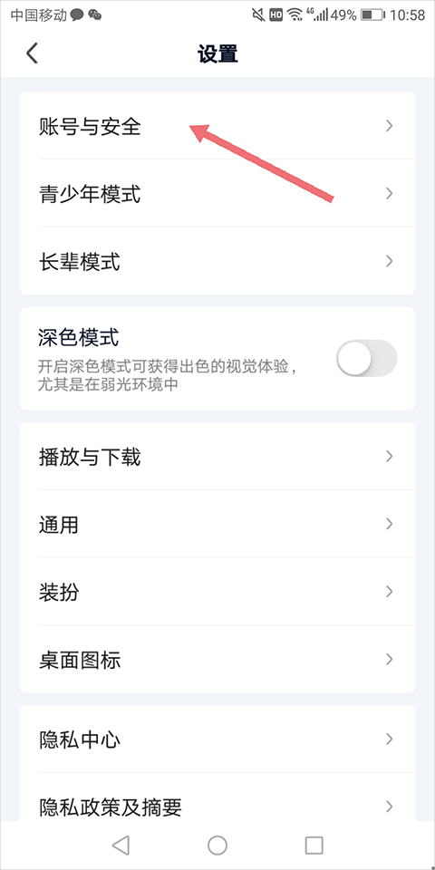 2、 在打开的设置页面内点击【账号与安全】,并点击进入;