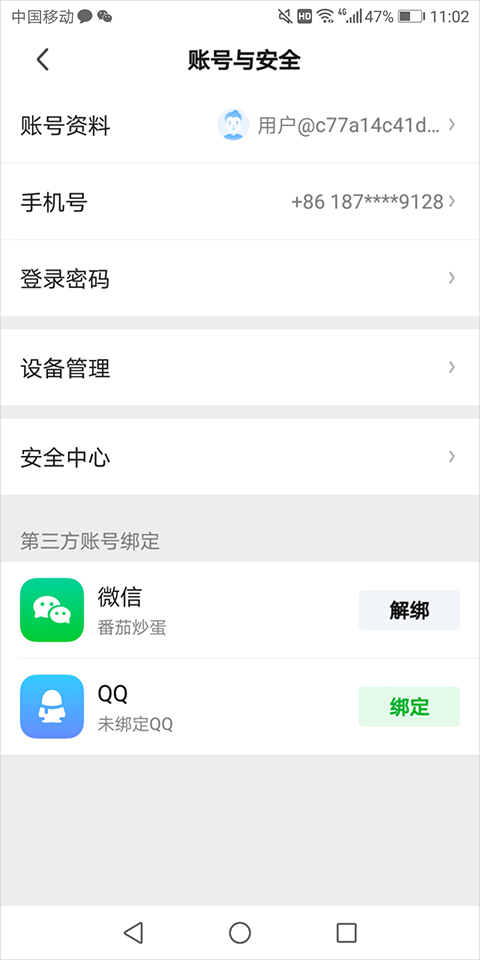 3、在账号与安全页面内,找到第三方账号绑定,如果用户绑定了微信号,那么另一个用户可以绑定其qq号即可