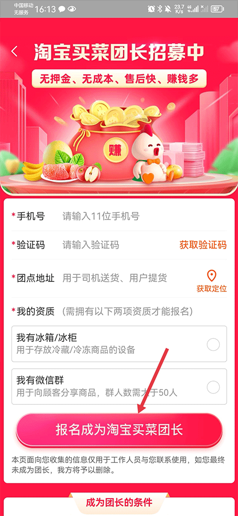 3、然后将手机号码、验证码、团长地址等信息填写完成后点击报名成为淘宝买菜团长