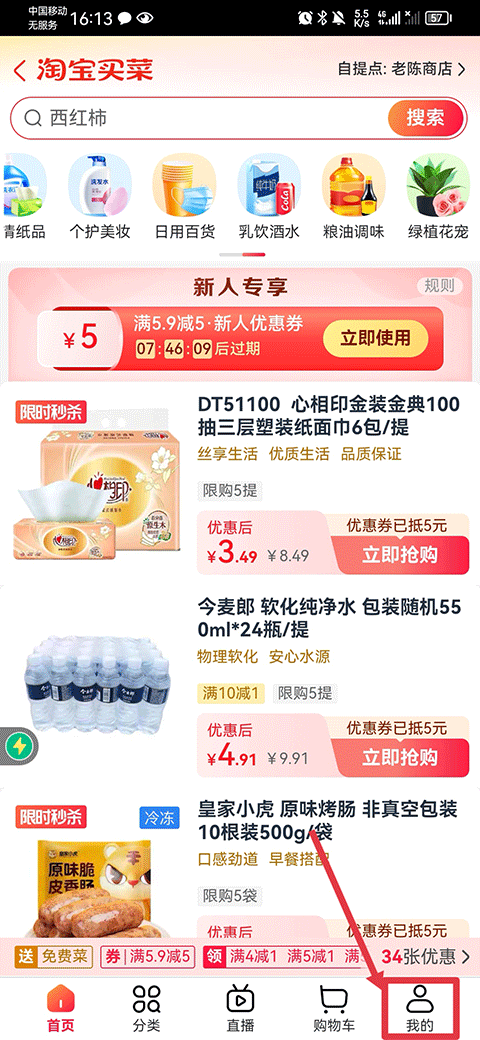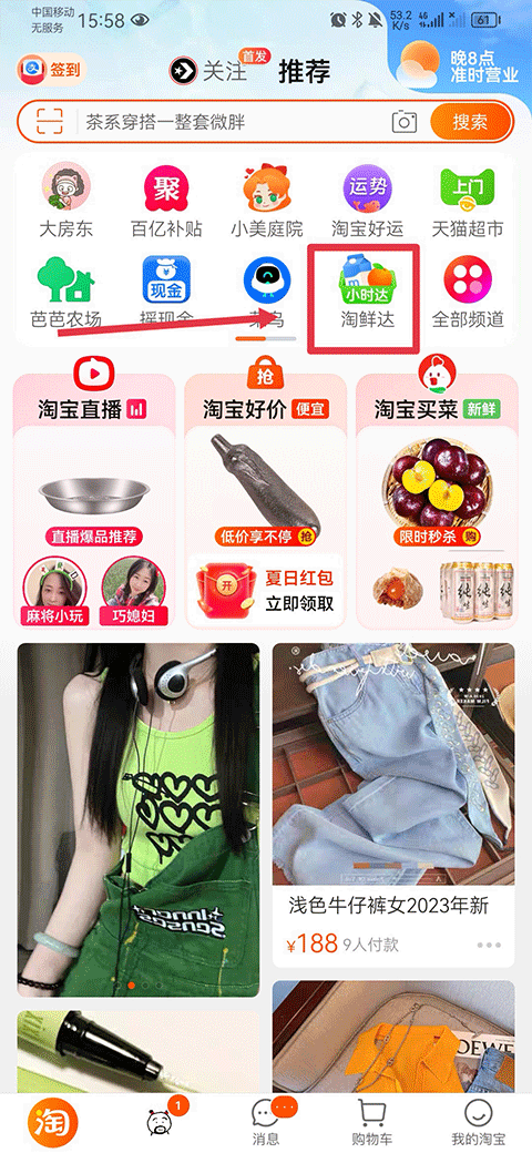 1、打开淘宝app后,在首页中点击淘鲜达就是淘宝买菜的入口