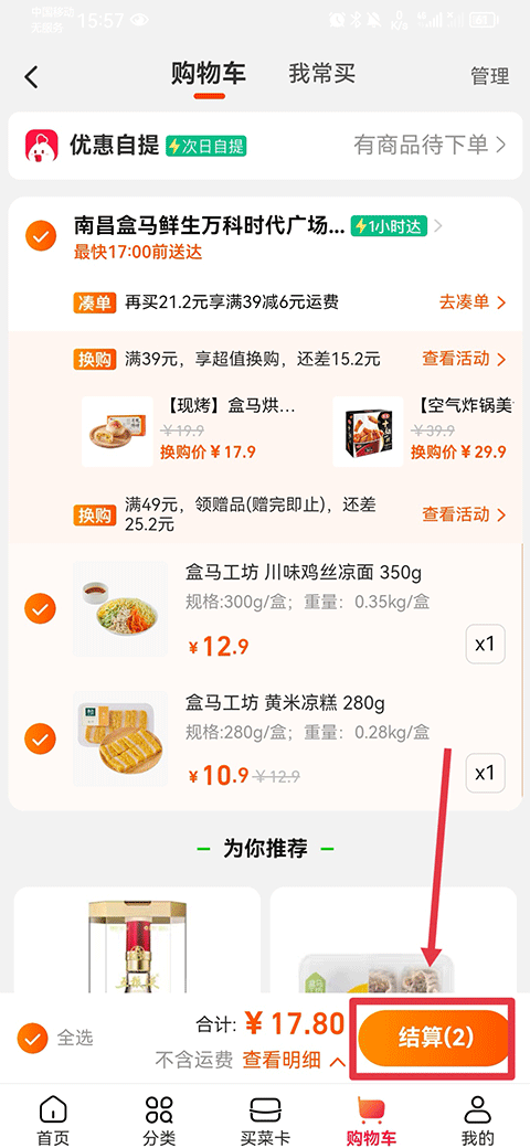 3、选择完成后在购物车内将商品全部勾选并点击结算