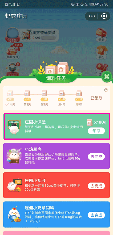 9、最后就可以通过点击“去领取”的功能按钮去蚂蚁庄园领取饲料了。