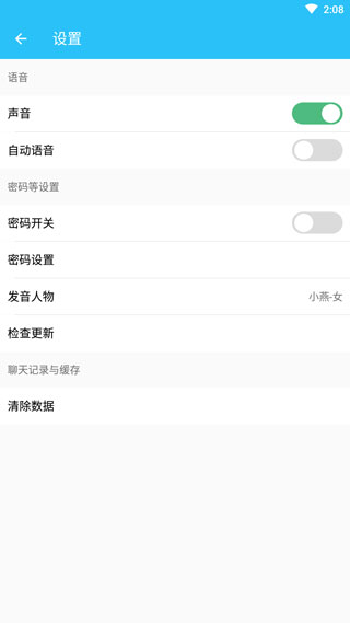 5、点击设置,你可以调整软件的语音,以及密码、聊天记录。