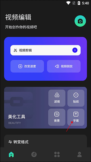 1、进入皮皮剪辑app点击主页中美化工具中的字幕;
