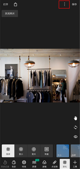 1、下载安装本站提供的泼辣修图免费破解版软件,先选择右上角的三点按钮;
