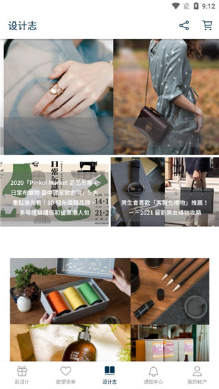 2、进入软件后,分为:逛设计、欲望清单、设计志、通知重新、我的账号五大分类;