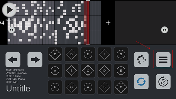 3、接着在下面键盘中安处你的琴键,按完后点击右箭头进入下一行编辑
