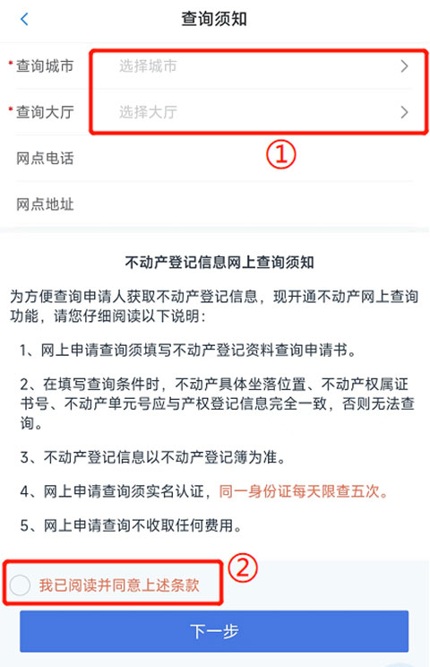 2、选择【网上查询】-【不动产资料查询】,依次选择【查询城市】和【查询大厅】,勾选“我已阅读并同意上述条款”,点击【下一步】
