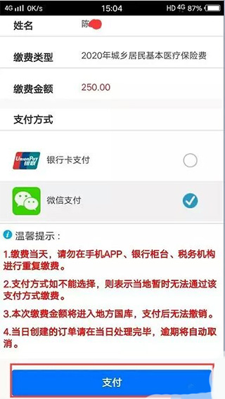 如需代人缴费,可以点击【代人缴费】,在代人缴费页面输入被代缴用户的身份证和姓名,点击【确认】后进入缴费查询界面,点击确认,查询出被代缴人的应缴金额,确认金额后,点击【下一步】可继续进行支付,完成替他人代缴费。