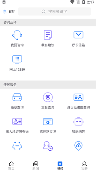 3、用户可以在这里进行咨询互动,可以在这里进行查询违章记录、重名查询、查看高速时况、对出入境证照进行查询等;