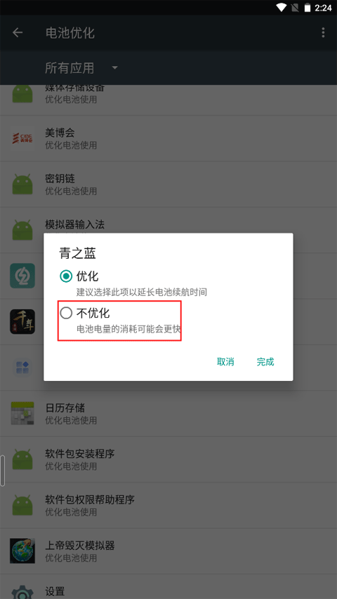 打开手机设置,搜索电池优化(点击这里快捷打开),点电池优化界面的左上角切换到所有应用,然后找到青之蓝,把电池优化修改为不允许即可。本插件耗电非常非常少基本忽略不计,所以可以放心关闭自动电池优化功能。