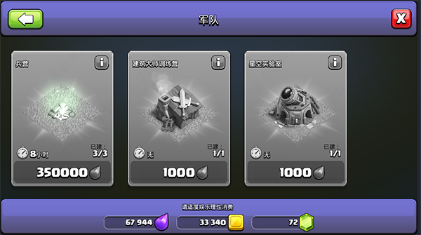 这时候可以建更多的建筑了。现在资源生产的速度比以前快很多,能招募的兵也更多了。现在可以升级自己的练兵场(注意前期只要升级一个就够了),完善各类资源类建筑。防御类建筑最后建造。