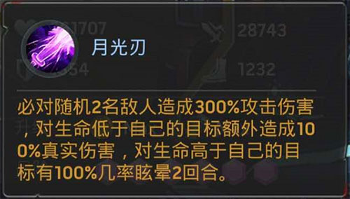 一技能:对随机2名敌人造成高额伤害,对血量比自己低的目标造成100%真实伤害,而比自己血量高的目标则是100%眩晕,这个技能简直就是无敌的存在!