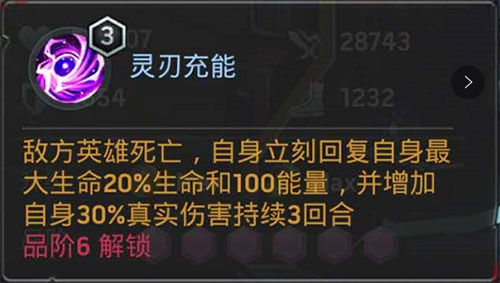 四技能:敌方英雄死亡时,则回复艾莉亚100的能量并增加30%真实伤害,进一步提高艾莉亚输出能力和释放技能的频率!