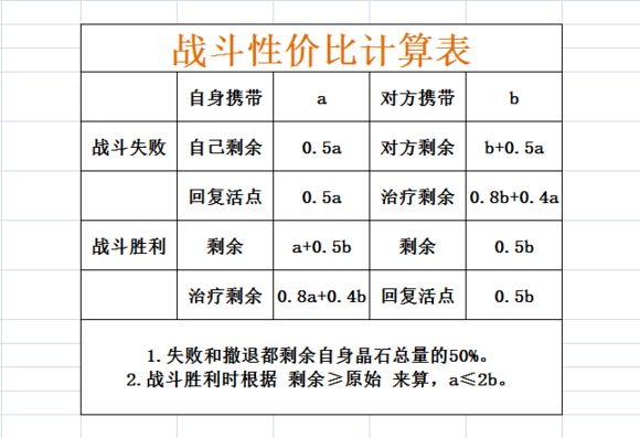 同样,在这张表上,我们可以看到,如果你自身携带的晶石是100,对面只要携带超过50,单纯从晶石数量上来说,打赢以后至少不亏。这样可能有点难理解,最容易理解的就是,如果你身上的石头是对面身上的2倍以上,不要点他决斗,不划算。举个例子,你身上携带了200石头,对面携带了80。如果你主动点他,打完以后你剩240,对面剩80。但是对面直接带着80石头回复活点,而你治疗以后反而只剩下192石头,得不偿失。